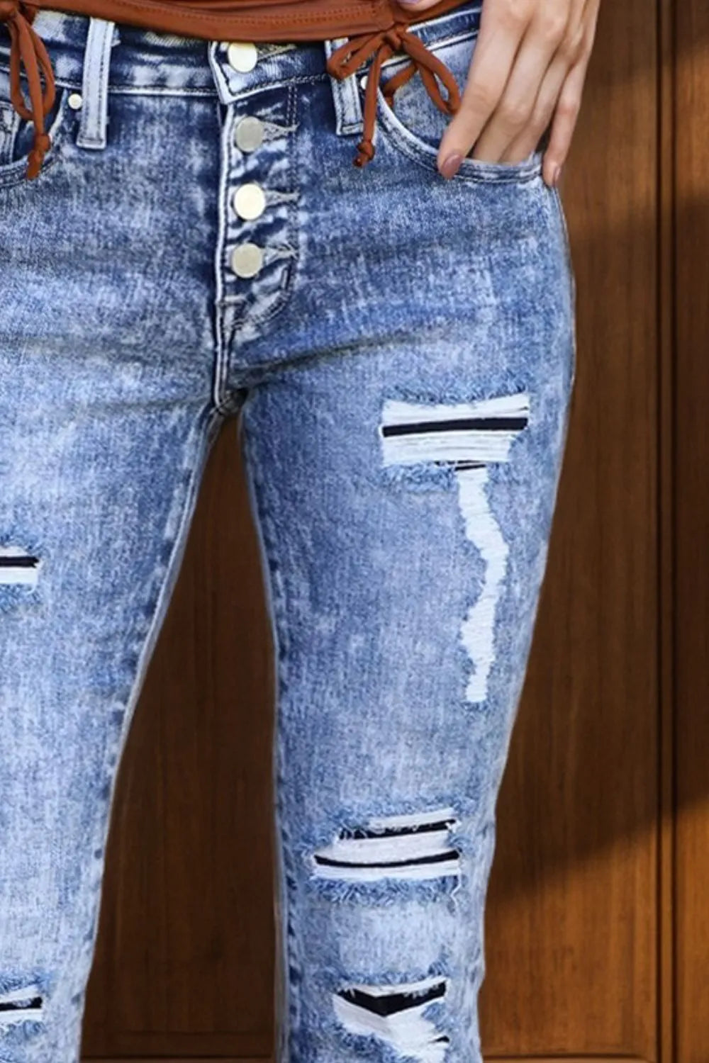 Distressed Button-Fly Bootcut Jeans with Pockets