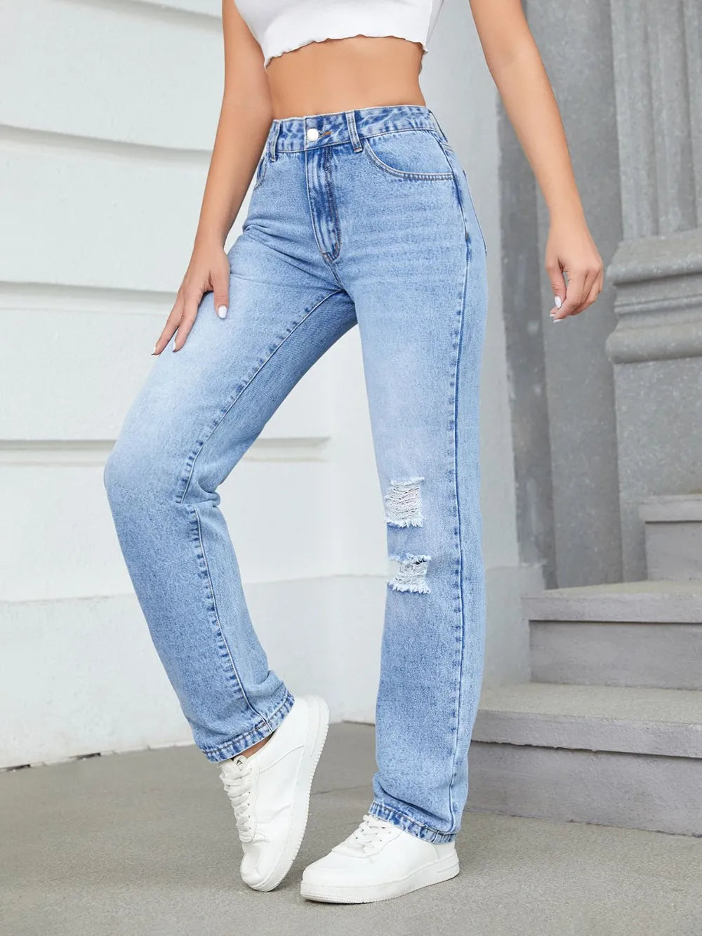 Loose high waisted casual ripped straight leg jeans and pants